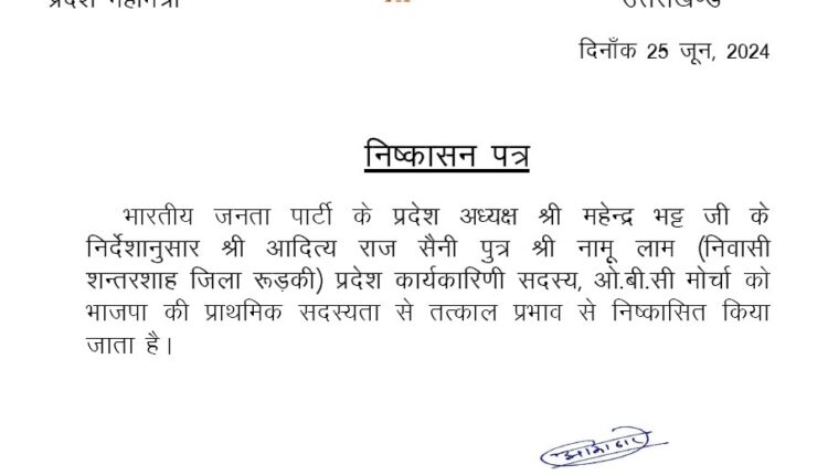 उत्तराखंड: 26 जून 2024, देहरादून। भाजपा प्रदेश अध्यक्ष महेंद्र भट्ट के निर्देश पर ओबीसी मोर्चा के प्रदेश कार्यकारिणी सदस्य आदित्य राज सैनी को पार्टी की प्राथमिक सदस्यता से निष्कासित कर दिया गया है। आदित्य राज सैनी और उसके नौकर पर नाबालिग से सामूहिक दुष्कर्म के मामले मुकदमा दर्ज किया गया। हरिद्वार बहादराबाद थाना क्षेत्र में हाईवे किनारे मिले एक किशोरी के शव के मामले में परिजनों ने सामूहिक दुष्कर्म कर हत्या करने का आरोप लगाया था। पुलिस ने किशोरी की मां की तहरीर पर पिछड़ा आयोग के सदस्य आदित्य राज सैनी व ग्राम प्रधान पति और उसके नौकर के खिलाफ सामूहिक दुष्कर्म, हत्या, साजिश सहित प्रभावी धाराओं में मुकदमा दर्ज कराया था। भीम आर्मी ने आरोपियों की गिरफ्तारी न होने तक किशोरी के शव का अंतिम संस्कार न करने की चेतावनी दी।