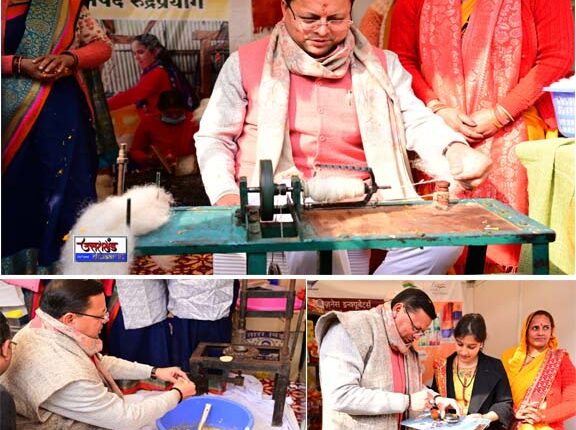 साथ ही रूरल बिजनेस इंक्यूबेटर की ओर से लगे स्टॉल पर शिल्पकार के उद्यमियों एवं स्वास्तिक स्वयं सहायता की महिलाओं के साथ मिलकर मुख्यमंत्री धामी ने स्टोन पेन्टिंग करते हुए उनकी संस्था की जानकारी ली। वहीं उन्नती क्लस्टर संगठन, कालीमठ कोटमा की महिलाओं के स्टॉल पर कताई एवं बुनाई की। संगठन की अध्यक्ष सरिता देवी ने उन्हें हाथकरघा की पूरी विधि बताते हुए अपने संगठन की जानकारी दी। उन्होंने समूह के उत्पादों की सराहना करते हुए श्री केदारनाथ धाम एवं यात्रा मार्ग पर भी आउटलेट खोलने एवं पारंपरिक तरीके से बन रहे दोखे, शौल, टोपी आदि का खूब प्रचार करने को कहा।