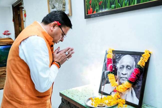 देहरादून/उत्तराखण्ड: 31 Oct.–2023: खबर…. राजधानी से मंगलवार को देहरादून स्थित मुख्यमंत्री आवास में राष्ट्रीय एकता दिवस के अवसर पर मुख्यमंत्री पुष्कर सिंह धामी ने सरदार वल्लभ भाई पटेल के चित्र पर श्रद्धा सुमन अर्पित कर श्रद्धांजलि दी।