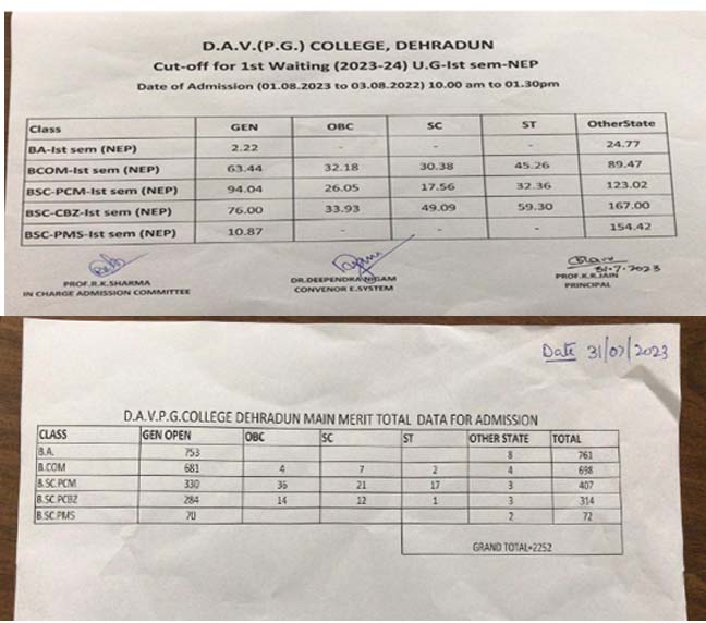 देहरादून/उत्तराखण्ड: 31 JULY .. 2023, खबर… राजधानी से सोमवार को देहरादून स्थित सूबे के सबसे बड़े डीएवी (पीजी) कॉलेज, में सीयूईटी 2023 स्नातक परीक्षा परिणाम के आधार पर बी.ए., बी.एससी., बी.कॉम. (B.A., B.Sc., B.Com.) प्रथम वर्ष में प्रवेश हेतु मेरिट सूची जारी, कल अर्थात 1 अगस्त 2023 से प्रवेश प्रक्रिया प्रारंभ।प्राचार्य प्रो डॉक्टर के आर जैन तथा प्रवेश समिति के समन्वय डॉ आर के शर्मा द्वारा प्रवेश संबंधी प्रमुख तिथियों तथा प्रक्रिया को जारी कर दिया गया है! वही आज प्राचार्य प्रो डॉक्टर के. आ.र जैन तथा प्रवेश समिति के समन्वय डॉ. आर के शर्मा द्वारा प्रवेश संबंधी प्रमुख तिथियों तथा प्रक्रिया को जारी कर दिया गया है !