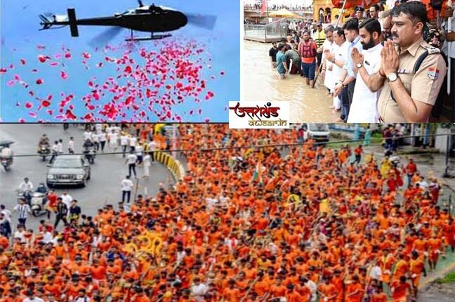 देहरादून/उत्तराखण्ड: 07 JULY .. 2023, खबर… राजधानी से शुक्रवार को देहरादून स्थित सावन प्रारंभ होते ही उत्तराखंड के धर्मनगरी हरिद्वार में पहले दिन भोले नाथ के भक्तो पर उत्तराखण्ड के युवा मुख्यमंत्री पुष्कर सिंह धामी के निर्देश पर यहां पहुंचने वाले कांवड़ियों पर हेलीकॉप्टर से पुष्पवर्षा की गई। वही गुरुवार को हरिद्वार में गंगा जल लेने पहुंचे लाखों की संख्या में कांवड़ लेकर पहुँचने वाले श्रद्धालुओं का धर्मनगरी में भव्य स्वागत किया गया। जिसके बाद एडीजी और एसएसपी ने हेलीकॉप्टर से कांवड़ियों पर फूल बरसाए। आसमान से पुष्पवर्षा होता देख शिवभक्त भी उत्साहित हो गए इस दौरान कांवड़ियों ने बम.बम भोले की गूंज से हरिद्वार को भक्तिमय कर दिया।