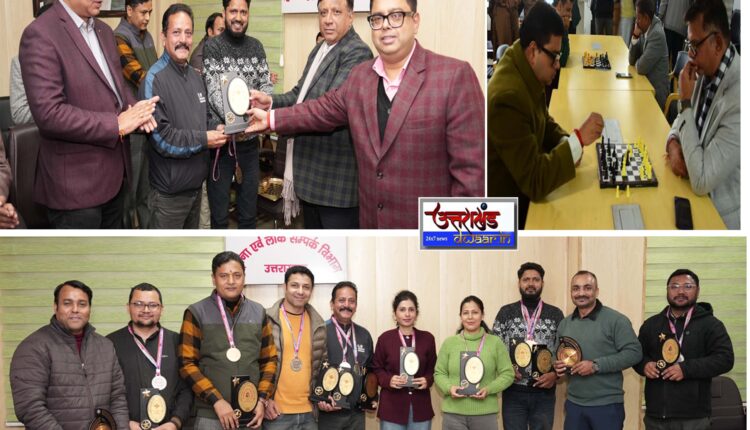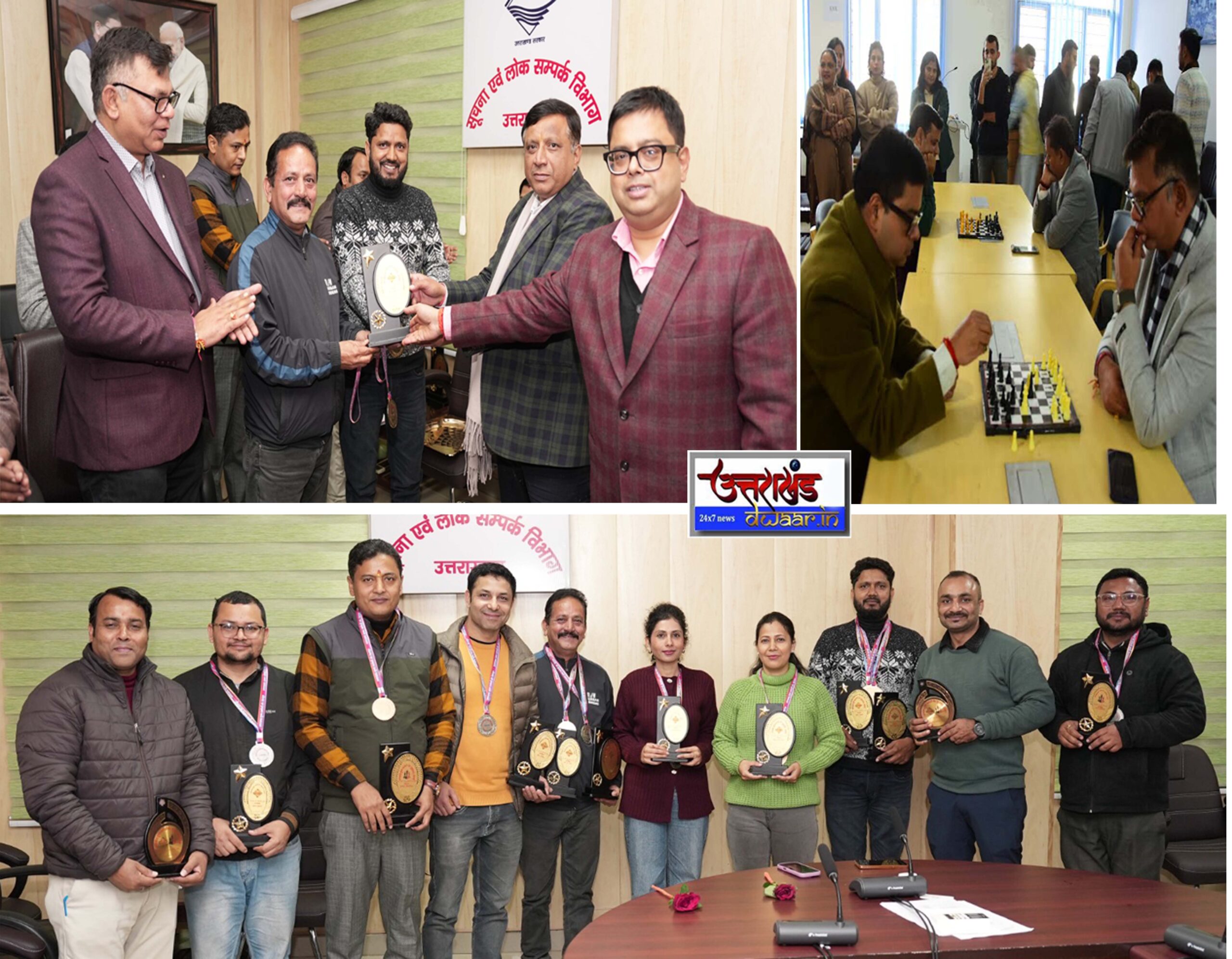 स मौके पर महानिदेशक सूचना श्री तिवारी द्वारा शतरंज प्रतियोगिता में विजयी रहे कैलाश रावत एवं उप विजेता राजेन्द्र सिंह कलूड़ा को पुरस्कृत किया गया। महिला वर्ग में कैरम सिंगल्स की विजेता श्रीमती आरती बिष्ट एवं उप विजेता सुश्री विदिशा नेगी को पुरस्कार प्रदान किये गये। कैरम प्रतियोगिता में पुरूष वर्ग के सिंगल्स श्रेणी के विजेता अतुल डिमरी एवं उप विजेता गजेन्द्र सिंह को पुरस्कृत किया गया। कैरम प्रतियोगिता के डबल्स श्रेणी में विजेता अतुल डिमरी एवं गजेन्द्र सिंह, उप विजेता चेतन कुमार पाण्डेय एवं राम सिंह परजोली को पुरस्कृत किया गया। यह खेल प्रतियोगिता विगत 12 एवं 14 दिसंबर, 2025 को सूचना भवन सभागार में आयोजित की गई थी।