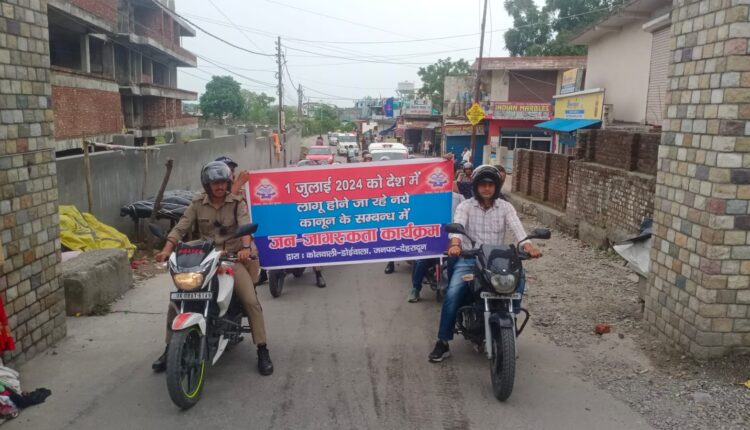 वरिष्ठ पुलिस अधीक्षक देहरादून अजय सिंह द्वारा 01 जुलाई 2024 से सम्पूर्ण देश मे लागू हो रहे 03 नये कानूनों (1- भारतीय न्याय सहिंता 2023 2-भारतीय नागरिक सुरक्षा संहिता2023 3- भारतीय साक्ष्य अधिनियम 2023) के क्रियान्वयन के संबंध में आम जन को जागरूक करने हेतु व्यापक स्तर पर प्रचार-प्रसार करने के सभी अधीनस्थों को निर्देशित किया गया। निर्गत निर्देशों के क्रम मे प्रभारी निरीक्षक कोतवाली डोईवाला द्वारा थाना डोईवाला व चौकी हर्रावाला, लालतप्पड व जौलीग्रान्ट पर तैनात समस्त अधिकारी/कर्मचारीगणों को साथ लेकर सम्पूर्ण थाना क्षेत्र डोईवाला मे मोटर साइकिल व सरकारी थाना मोबाइल व हाईवे-4 के माध्यम से रैली का आयोजन किया गया। रैली के दौरान नये कानूनो के लागू/क्रियान्वयन होने के सम्बन्ध मे लाउड स्पीकर के माध्यम से आमजन को अवगत कराया गया साथ ही थाना क्षेत्र मे निवासरत लोगो को नये कानून की जानकारी देकर जागरूक किया गया।