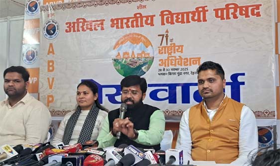 देहरादून स्थित परेड ग्राउंड में राष्ट्रीय अधिवेशन के निमित्त पत्रकार वार्ता का आयोजन किया, जिसमें अखिल भारतीय विद्यार्थी परिषद (अभाविप) का 71वाँ राष्ट्रीय अधिवेशन आगामी 28 से 30 नवंबर को देवभूमि उत्तराखण्ड के देहरादून स्थित परेड ग्राउंड में अस्थाई रूप से स्थापित ‘भगवान बिरसा मुंडा नगर’ में आयोजित होगा। जिसमें देशभर से 1500 से अधिक प्रतिनिधि, जिनमें विद्यार्थी, शिक्षक, शिक्षाविद, पूर्णकालिक कार्यकर्ता के साथ भारत के प्रमुख विश्वविद्यालयों के छात्रसंघ पदाधिकारी भी सम्मिलित होंगे।