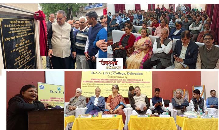 देहरादून/उत्तराखण्ड: 25-MARCH.. 2023, खबर… राजधानी से शनिवार को आज सूबे के सबसे बड़े महाविद्यालय, डीएवी (पीजी) कॉलेज करनपुर देहरादून में हिमांशु नैथानी मेमोरियल ओएनजीसी बैडमिंटन हॉल का औपचारिक रूप से उद्घाटन कार्यक्रम तथा महर्षि दयानंद सरस्वती जी की 200वी जयंती समारोह का उद्घाटन कार्यक्रम संपन्न हुए l वही इस दौरान मुख्य अतिथि,कैबिनेट मंत्री उत्तराखण्ड सरकार गणेश जोशी तथा ओएनजीसी कारपोरेट प्रशासन की प्रमुख श्रीमती आर एस नारायणी सीएसआर प्रमुख तथा अशोक नारंग सदस्य प्रबंध समिति मुख्य रूप से उपस्थित रहे l इस अवसर पर विधायक खजान दास, भाजपा प्रदेश मंत्री आदित्य चौहान, कॉलेज के डीएवी (पीजी) प्राचार्य डा0 के.आर .जैन, ओएनजीसी ईडी नारायनी, रामनाथ दिवेदी, पीबीओआर अध्यक्ष शमशेर सिंह बिष्ट सहित कई लोग उपस्थित रहे। इस कार्यक्रम के संयोजक डॉ. रवि शरण दिक्षित ने किया !