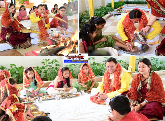 उत्तराखण्ड: 26 MARCH.2026, बृहस्पतिवार को देहरादून/राजधानी स्थित मुख्यमंत्री आवास में रामनवमी के शुभ अवसर पर मुख्यमंत्री श्री पुष्कर सिंह धामी ने कन्या पूजन कर देवी स्वरूपा बालिकाओं का सम्मान किया। इस दौरान उन्होंने पारंपरिक रीति-रिवाजों के अनुसार कन्याओं को भोजन कराया तथा उनका आशीर्वाद प्राप्त किया।