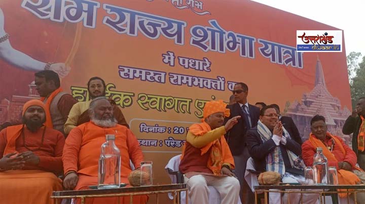 देहरादून/उत्तराखण्ड: 20 Jan.–2024: खबर…. राजधानी से शनिवार को देहरादून स्थित परेड ग्राउंड देहरादून में जय श्री राम… जय श्री राम के जयकारों की गूंज शनिवार को शहर में सुनाई दी। श्री राम मंदिर प्राण प्रतिष्ठा उत्सव समिति, द्वारा आयोजित “राम राज्य शोभायात्रा“ कार्यक्रम में दून शहर की सड़कों पर श्रीराम के जयकारे लगाते हुए महिलाएं, बच्चे, युवा सभी निकल पड़े। वही इस मौके पर “राम राज्य शोभायात्रा“ कार्यक्रम में मुख्यमंत्री पुष्कर सिंह धामी ने प्रतिभाग किया।