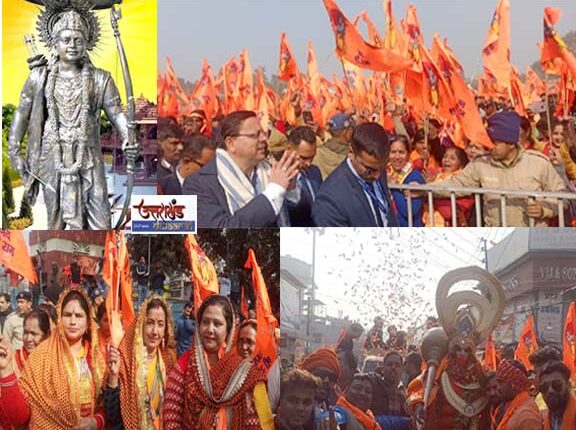 देहरादून/उत्तराखण्ड: 20 Jan.–2024: खबर…. राजधानी से शनिवार को देहरादून स्थित परेड ग्राउंड देहरादून में जय श्री राम… जय श्री राम के जयकारों की गूंज शनिवार को शहर में सुनाई दी। श्री राम मंदिर प्राण प्रतिष्ठा उत्सव समिति, द्वारा आयोजित “राम राज्य शोभायात्रा“ कार्यक्रम में दून शहर की सड़कों पर श्रीराम के जयकारे लगाते हुए महिलाएं, बच्चे, युवा सभी निकल पड़े। वही इस मौके पर “राम राज्य शोभायात्रा“ कार्यक्रम में मुख्यमंत्री पुष्कर सिंह धामी ने प्रतिभाग किया।
