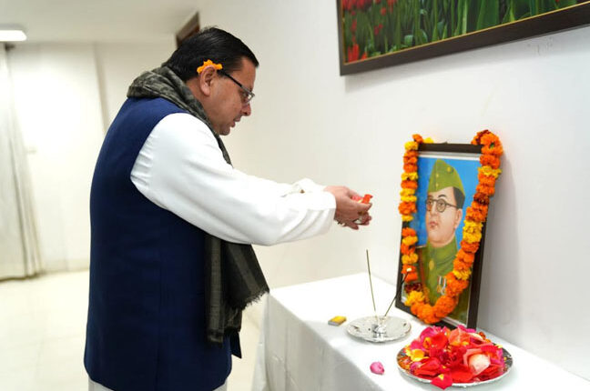 देहरादून/उत्तराखण्ड: 23-JAN.. 2023, खबर…. राजधानी से सोमवार को मुख्यमंत्री पुष्कर सिंह धामी ने नेताजी सुभाष चंद्र बोस की जयंती पर मुख्यमंत्री आवास में उनके चित्र पर श्रद्धासुमन अर्पित कर श्रद्धांजलि दी। उन्होंने कहा कि आजाद हिन्द फौज के नेतृत्वकर्ता, भारतीय स्वतंत्रता संग्राम के महानायक, नेताजी सुभाष चंद्र बोस जी ने राष्ट्र की स्वाधीनता के लिए अपना जीवन समर्पित किया। उन्होंने “पराक्रम दिवस“ की समस्त प्रदेशवासियों को शुभकामनाएं दी।