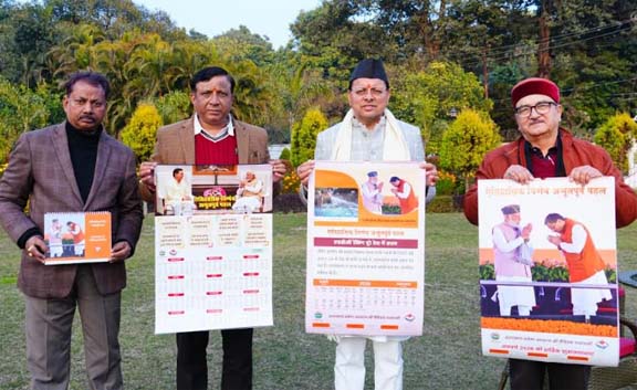उत्तराखंड: 12 Jan.2026,सोमवार को देहरादून / राजधानी स्थित मुख्यमंत्री आवास में सूचना विभाग, उत्तराखंड सरकार द्वारा प्रकाशित नववर्ष 2026 के आधिकारिक कैलेंडर का मुख्यमंत्री पुष्कर सिंह धामी ने विधिवत विमोचन किया। इस अवसर पर मुख्यमंत्री ने कैलेंडर के आकर्षक स्वरूप, उत्कृष्ट मुद्रण गुणवत्ता एवं विषयवस्तु की सराहना करते हुए कहा कि यह कैलेंडर राज्य सरकार की योजनाओं, उपलब्धियों तथा जनकल्याणकारी नीतियों के साथ-साथ सरकार द्वारा लिए गए ऐतिहासिक एवं दूरदर्शी निर्णयों को प्रभावी ढंग से जनमानस तक पहुँचाने का सशक्त माध्यम है।